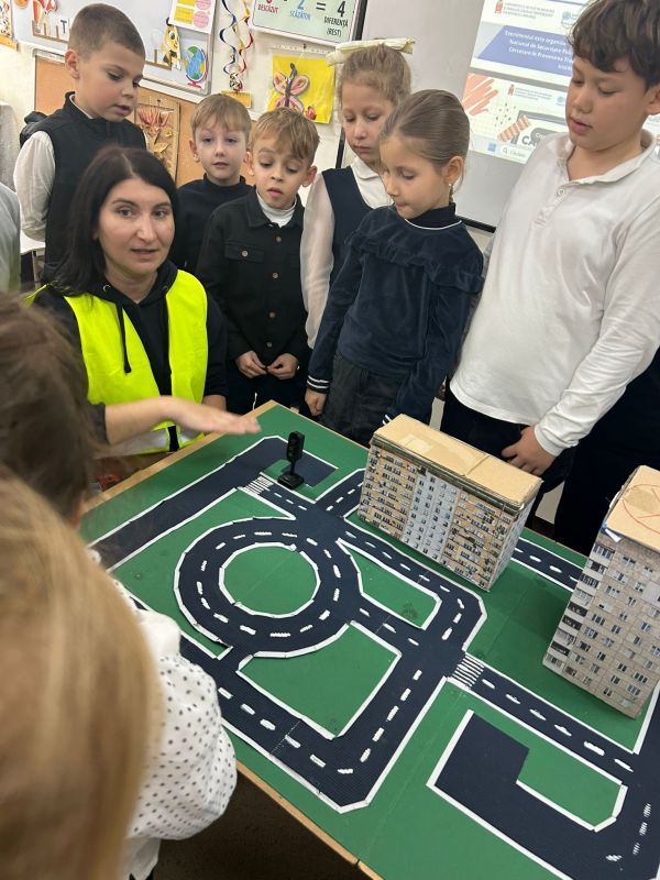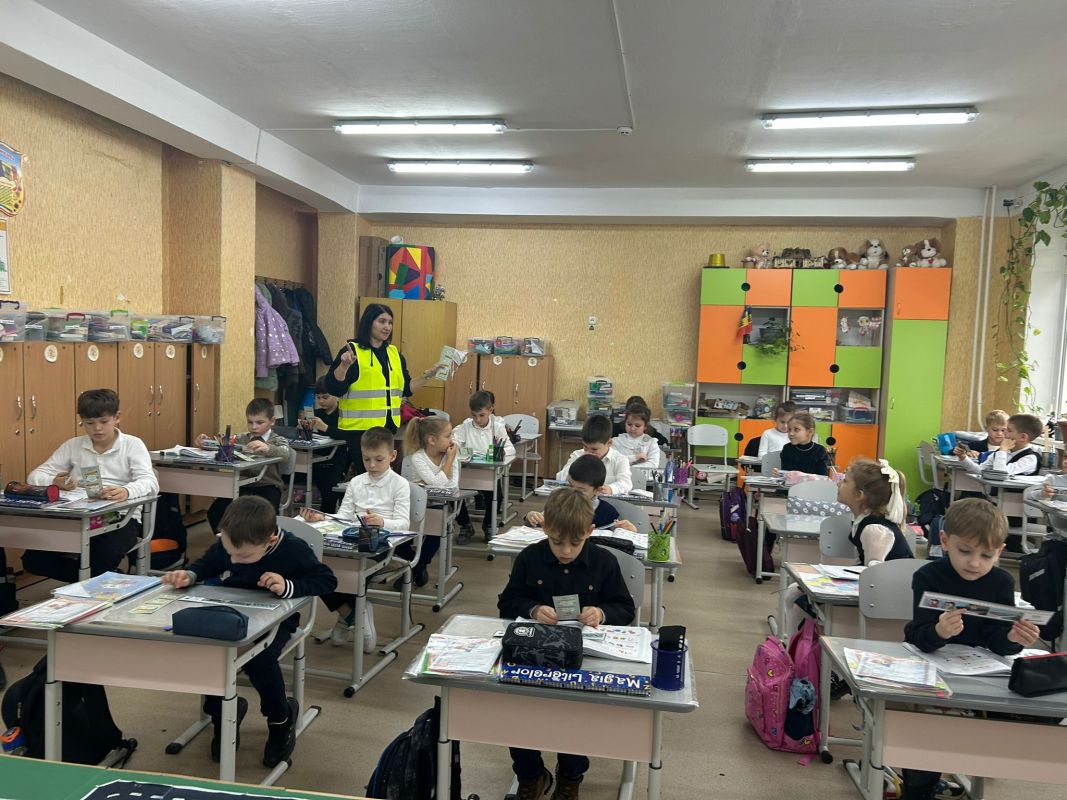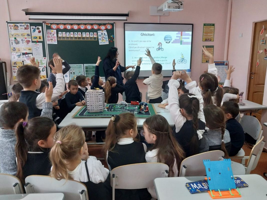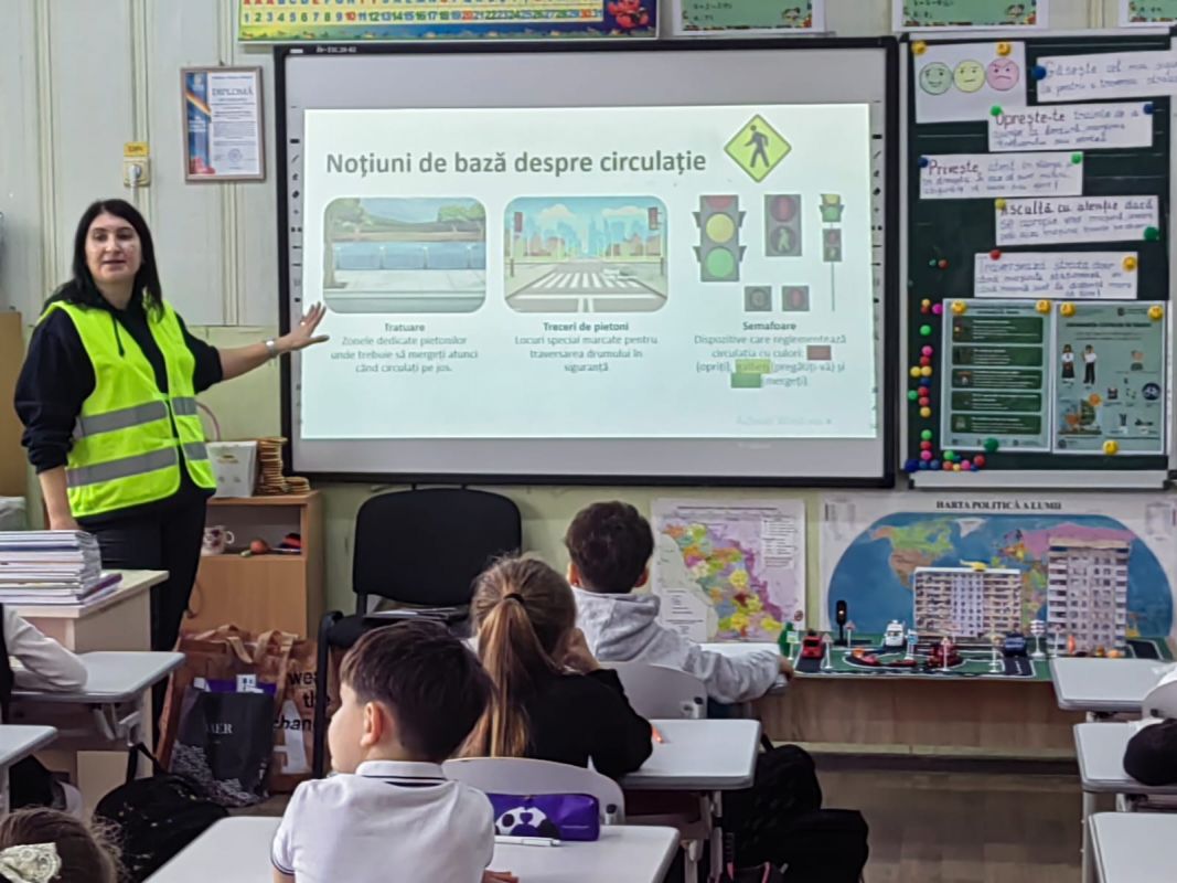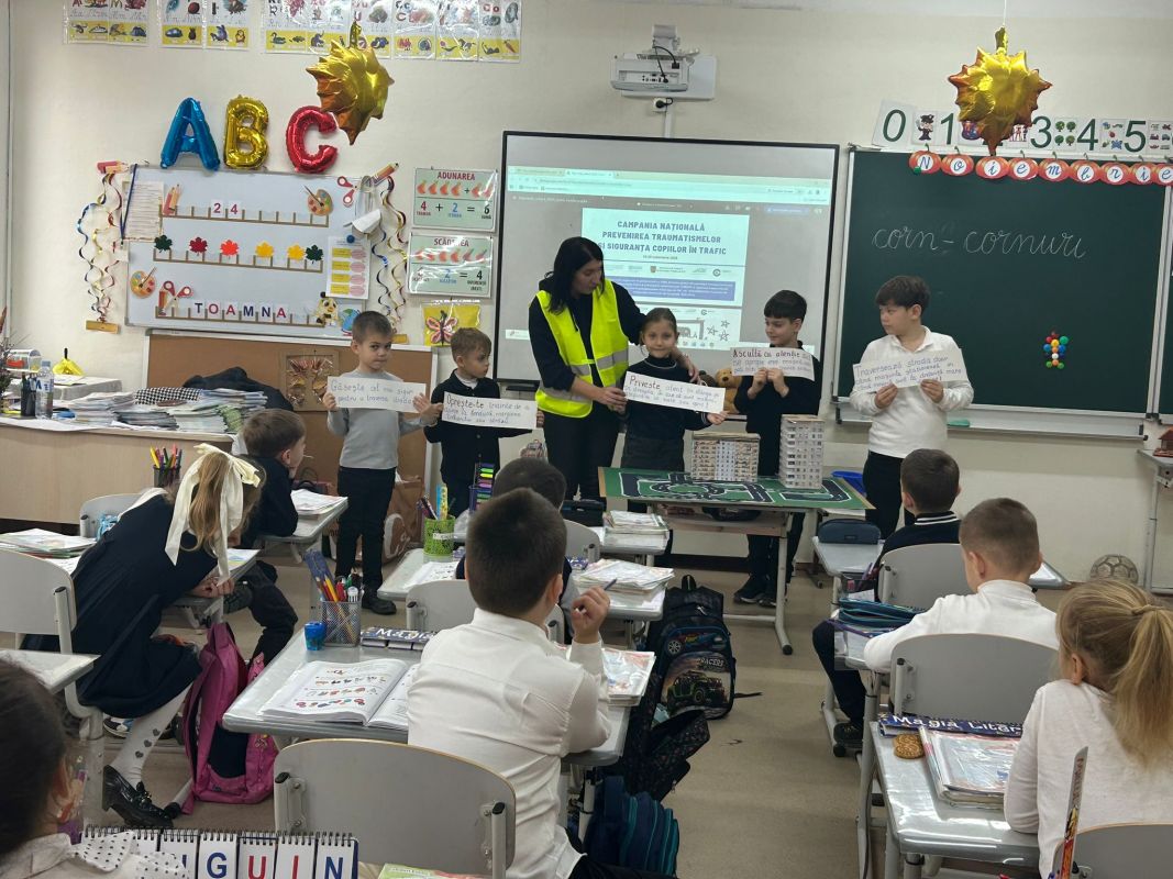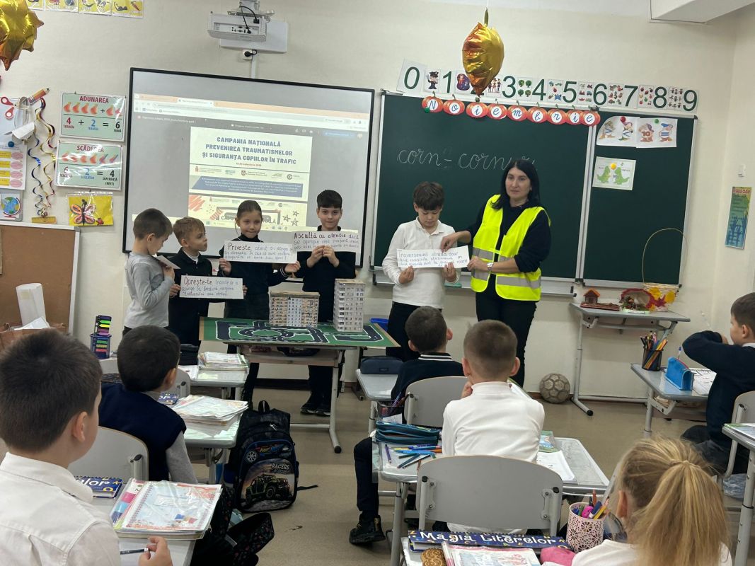 Practical activities were also carried out by primary school students from Mihail Sadoveanu Theoretical High School in Hincesti town, who became acquainted with the main road signs and participated in interactive exercises on how to cross a street safely and the responsible behavior of pedestrians. The activity had the role of consolidating theoretical knowledge and forming safe practical skills from an early age.